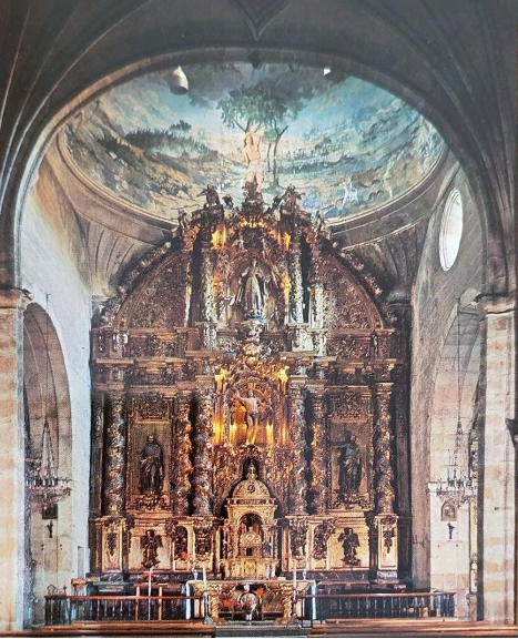 We arrived at the main altar located at the head of the church. As is customary in Christian churches, it faces east, because the Saviour was born in the East, and it is also the direction from which the sun, symbol of Christ, rises each day to illuminate us. Therefore, every Christian church is a hymn to the coming of Christ into the world. In the apse of the church, beneath a magnificent blue dome decorated with scenes of the martyrdom of Reinosa’s patron saint, stands the main altarpiece dedicated to Saint Sebastian, the parish’s patron saint. It is an excellent work erected in the first half of the 18th century. It stands out for its homogeneity and blends harmoniously into the apse, being one of the principal Churrigueresque Baroque altarpieces in Cantabria. It is attributed to the masters of Siete Villas. Between Solomonic columns is the pierced figure of Saint Sebastian, flanked by sculptures of the apostles Saint Peter and Saint Paul. The ensemble is crowned by the majestic figure of the Assumption of Mary. The image depicts the moment when the Virgin Mary, at the end of her earthly life, is assumed into Heaven, body and soul, while angels crown her Queen of Heaven. At the bottom of this magnificent altarpiece, between the images of two angels, the greatest treasure in the church—the Eucharistic Presence of the Lord in the Tabernacle—seems to go unnoticed. The living Christ has saved and redeemed us, freely given us eternal life, and is always by our side.
