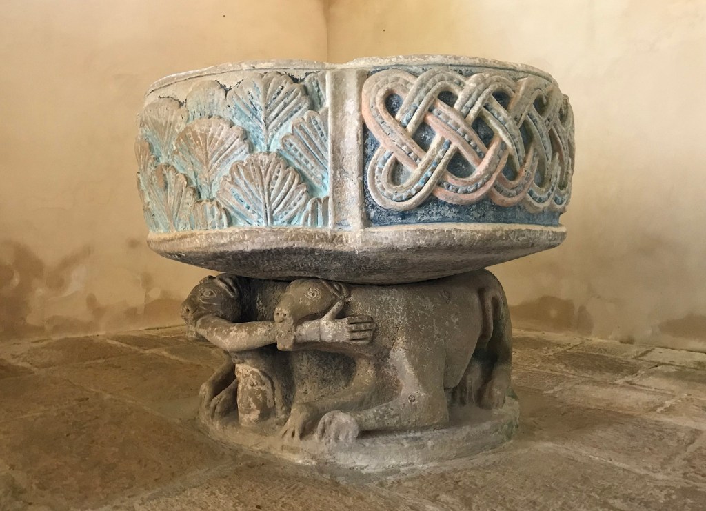 Before entering the sacred enclosure and delving into this place brimming with energy, art and spirituality, go to the baptistery. It is located to the left of the access to the temple, under the tower. There, we can discover an imposing baptismal font that stands out for its monumentality and its decorative value. It is a baptismal font that, together with that of Saint Mary of the Puerto in Santoña and that of the Collegiate Church of Saint Juliana in Santillana del Mar, is the culmination of the Cantabrian Romanesque. It has a four-lobed bowl, with a ribbed interior and the four fronts decorated with plant themes. In them remains of polychromy are still preserved.